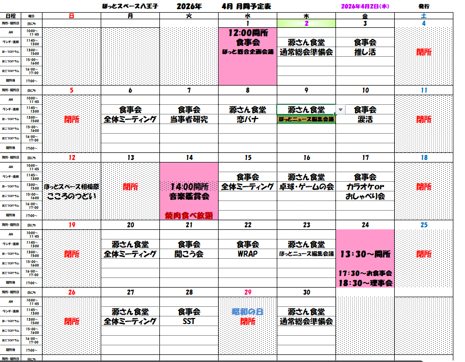 新年度、皆様いかがお過ごしでしょうか。ベネズエラそしてイランへの、米軍やイスラエル軍の侵攻の影響が世界各地におよぶきな臭い世の中ですが、まずはわたしたちが平和であること、一日一日を平和に過ごすこと、体調に影響を与える情報から離れること、そのうえでできることを無理のない範囲で準備しておくことは。災害対策にもきっと役に立つことでしょう。きな臭い世の中だからこそ、お互いがお互いのこころをまもることの大切さを実感します。ほっとスペース八王子もみなさまお一人お一人のこころをまもる居場所になれたら嬉しいです。新たに“源さん食堂”が始まりました。焼肉食べ放題に当事者研究にSST、そして定期総会に向けた準備をほっとスペース八王子は進めてまいります。